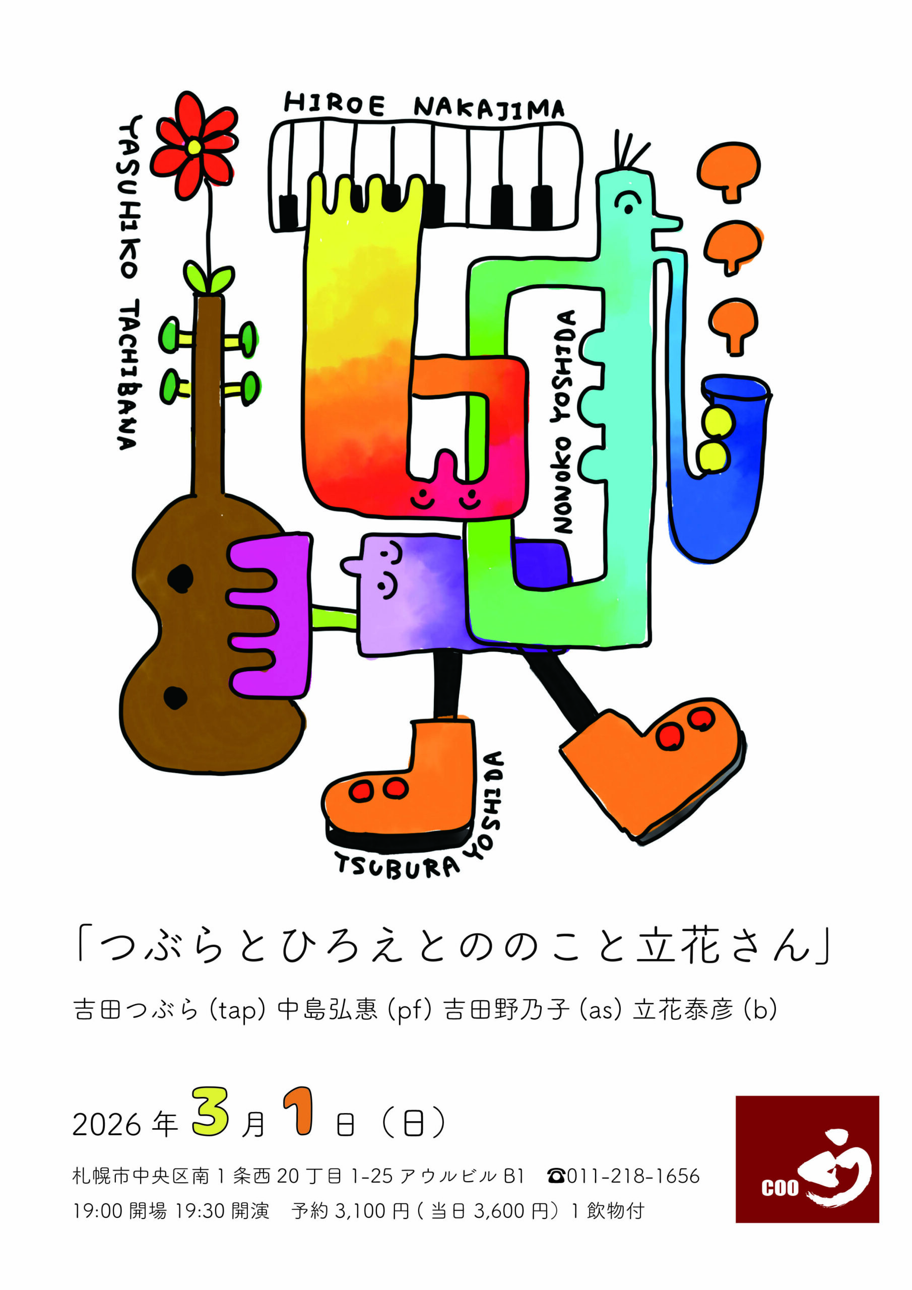 出演吉田つぶら(tap) 吉田野乃子(a.s) 中島弘惠(pf) 立花泰彦(b)